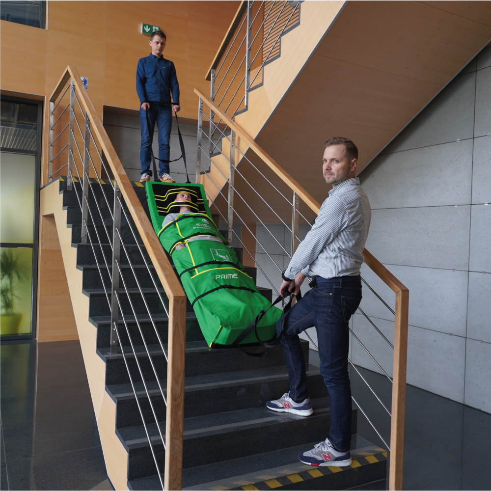 Materac Ratowniczy umożliwia ewakuację osób po schodach standardowych oraz o skomplikowanej budowie m.in. stalowych, betonowych, kamiennych. Materac jest odporny na trudne warunki dzięki zastosowaniu niezwykle wytrzymałego materiału Cordura® dzięki czemu sprosta oczekiwaniom najbardziej wymagającym użytkownikom. Dedykowany jest dla służb ratowniczych.